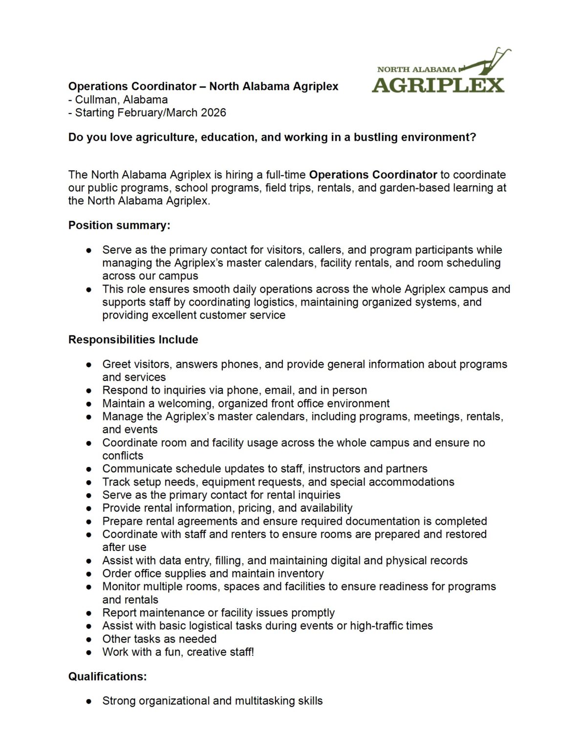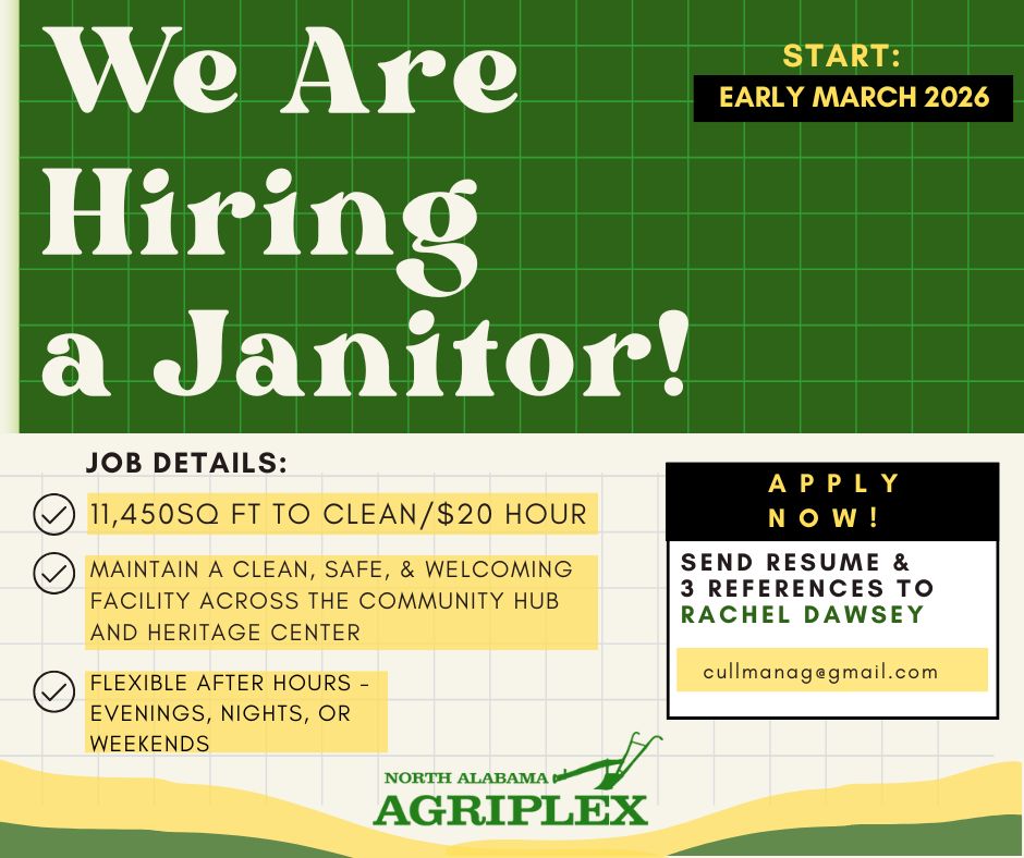 It is the policy of the North Alabama Agriplex that all persons are entitled to equality of opportunity in all areas of employment, regardless of race, sex, sexual orientation, gender identity, disability, age, national origin, religion, veteran status, genetic information, or other legally protected status.